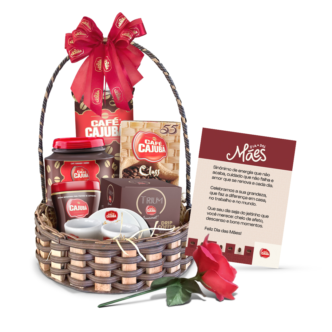 Cesta Cajubá 2: 01 café Cajubá Tradicional 500g + 01 café Cajubá Exportação 500g + 01 café Cajubá Class 500g + 01 cappuccino Cajubá Cremoso Canela 200g + 2 conjuntos pires/xícara Cajubá Sachê 80ml + Cesta/Laço. E mais um cartão e uma rosa.
